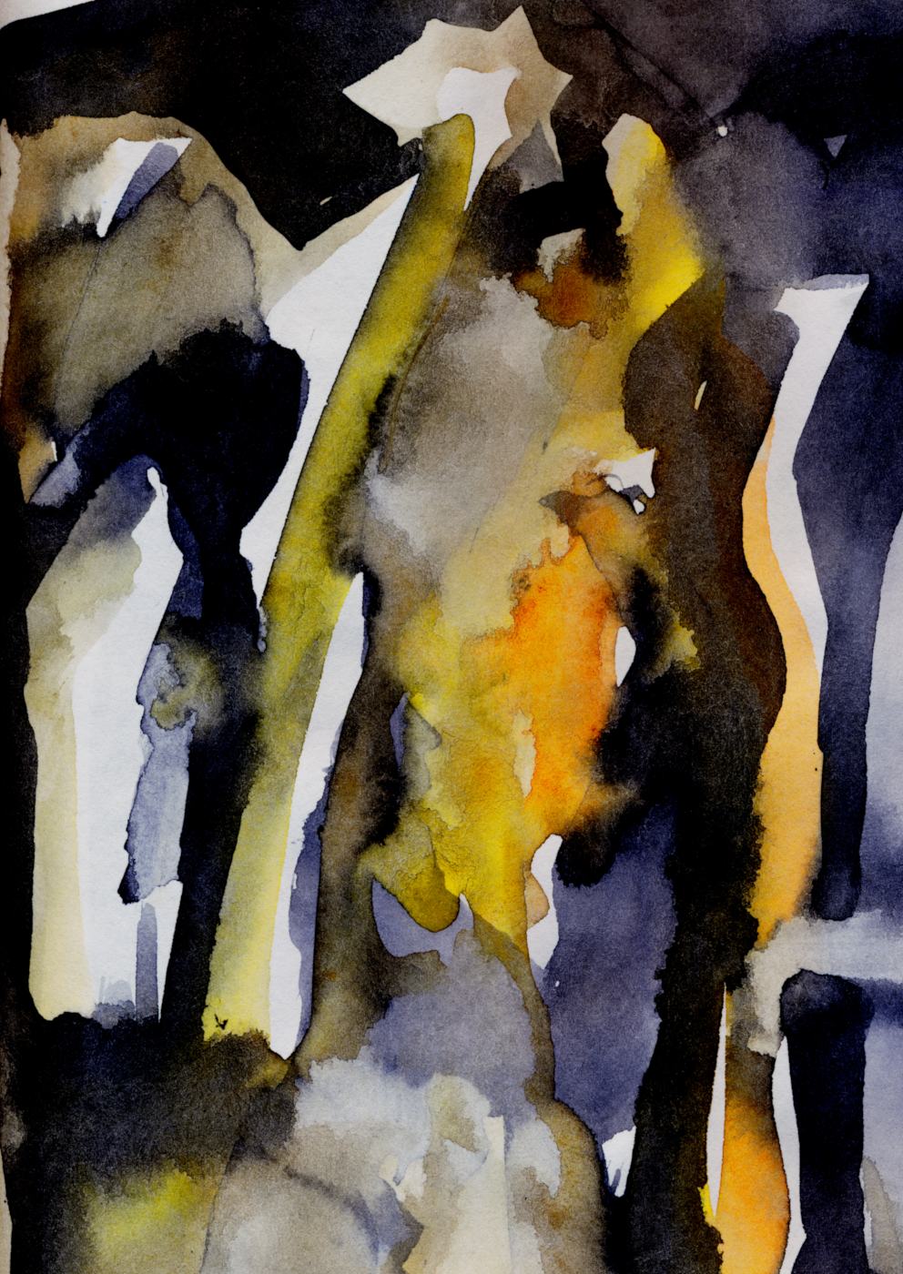 Ich hob diesen Schatz und verwandelte den kleinen Ausschnitt in eine Druckdatei in das Format DIN A1, erhältlich auf malamadita.de, meinem neuen Shop. Was bewegte mich diesen Ausschnitt zu wählen? Sicher hat es etwas mit dem Bildaufbau, den Farben und Strukturen zu tun. Aber was genau, fragte ich mich und startete ein Aquarellprojekt, indem ich diese Fundstücke aus de blauen Skizzenbuch in einer lockeren Weise als Vorlage nutze und ihren Formen und Farben nachspüre.
